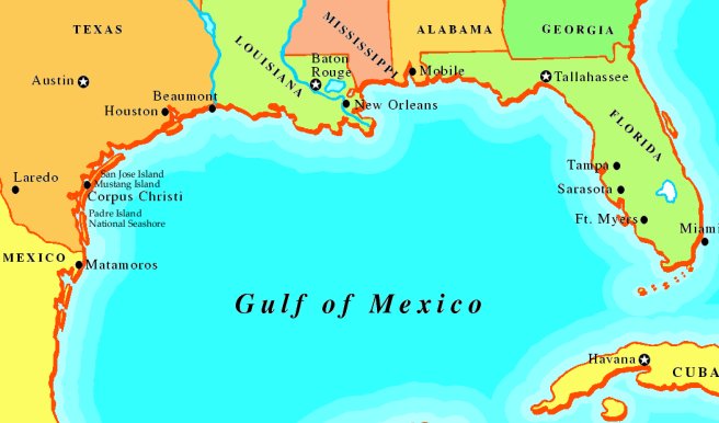 Map Of Gulf Of Mexico. The Gulf of Mexico consists of several ecological and geologic provinces, chief of which are the coastal zone, the continental shelf, the continental slope, and the abyssal plain. Find out where the Gulf of Mexico is located, how deep it is, what currents and hurricanes affect it, and what species of fish, sharks, and whales live in it. Find Gulf of Mexico countries, islands, cities, towns, roads on this map. The continental shelf forms an almost. You can download, print or use the map for educational, personal and non-commercial purposes with attribution. The coastal zone consists of tidal marshes, sandy beaches, mangrove-covered areas, and many bays, estuaries, and lagoons. S. states that border the Gulf of Mexico and their coastlines, areas, and population. Learn about the geography, climate, marine life, and history of the Gulf of Mexico, the world's largest gulf and a marginal sea of the Atlantic Ocean.